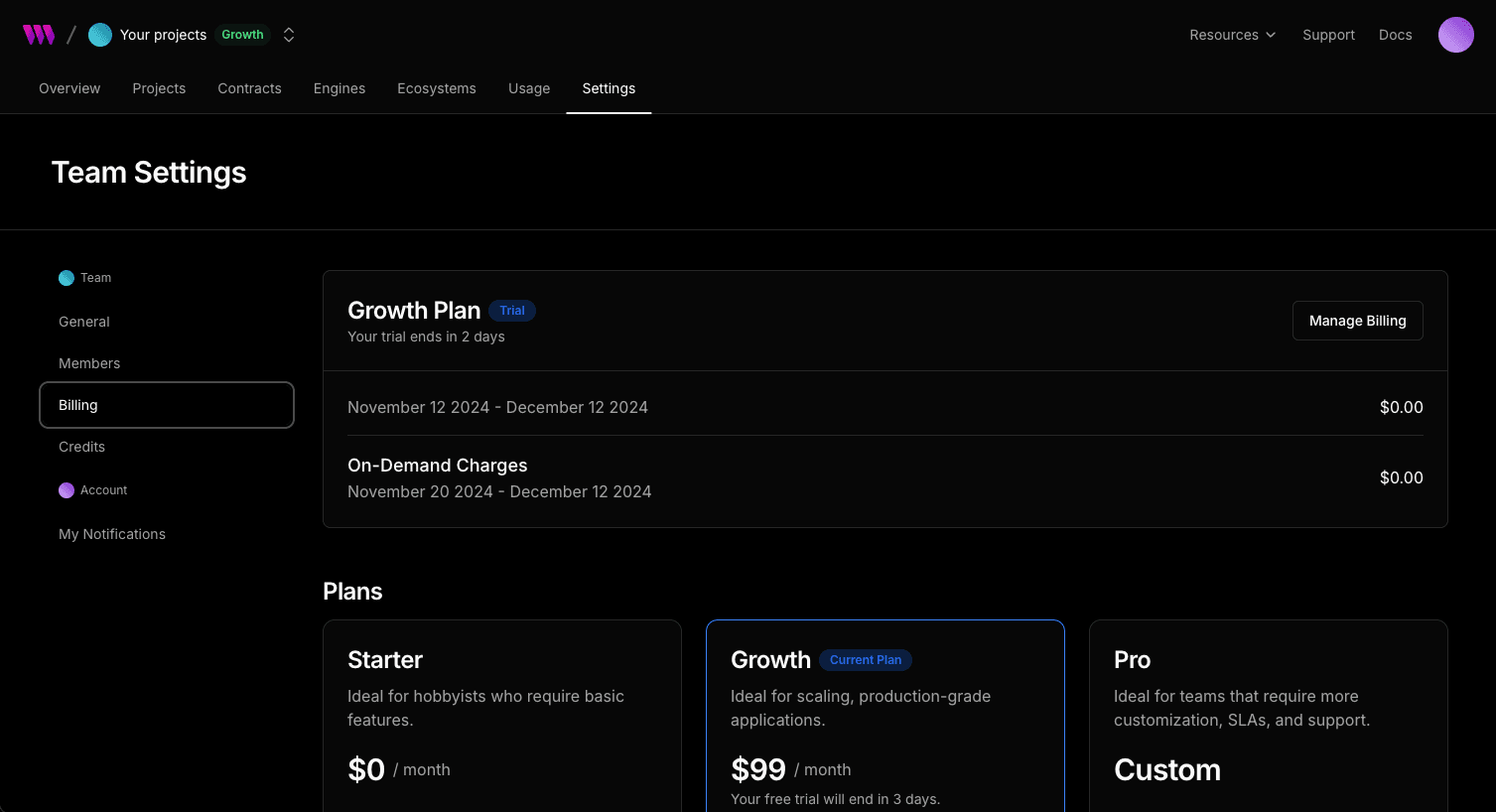 • On your dashboard, navigate to Settings > Billing > Manage Billing.