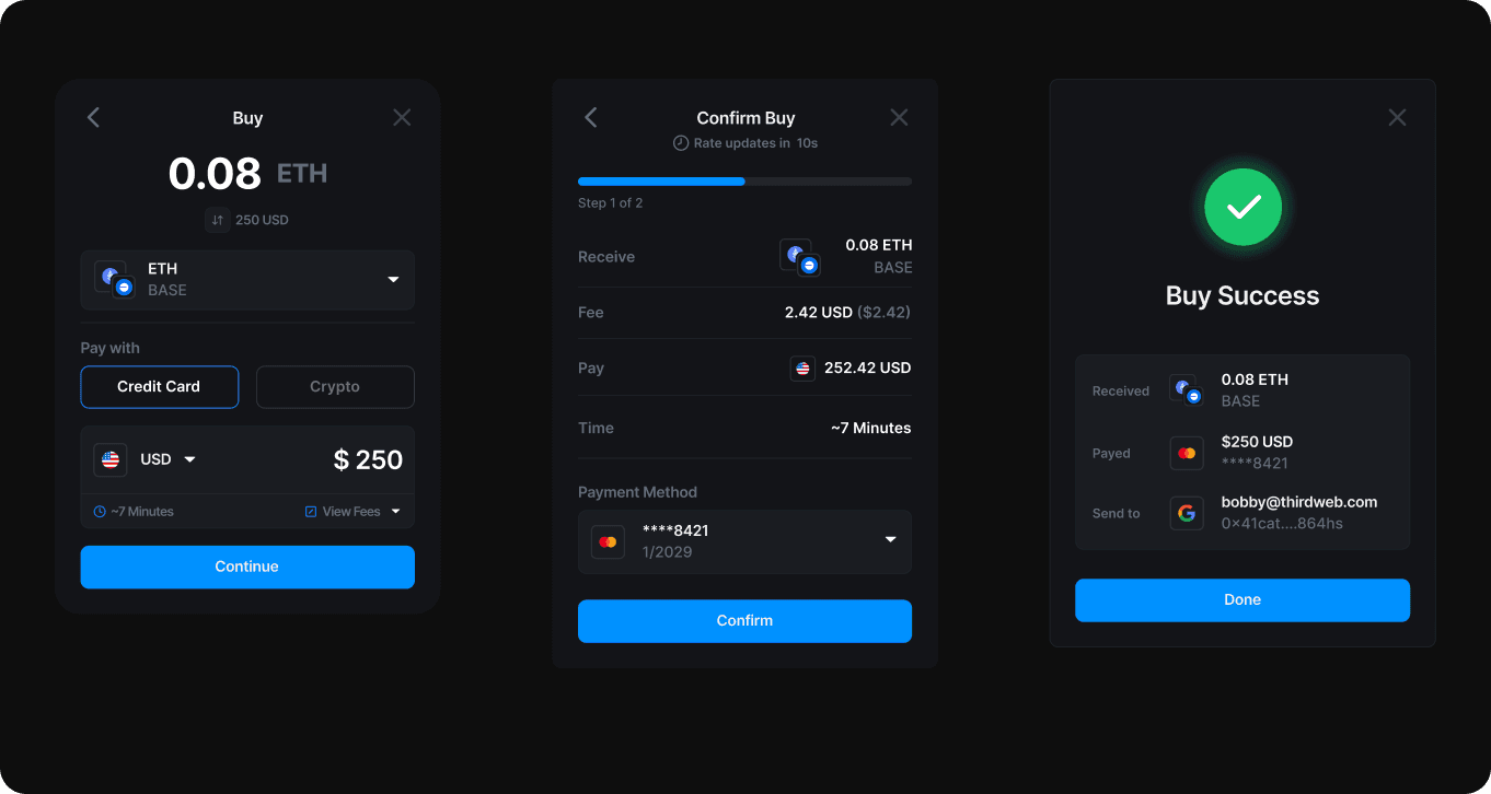 Direct integration with Stripe, Coinbase, and Transak for seamless fiat onramps.